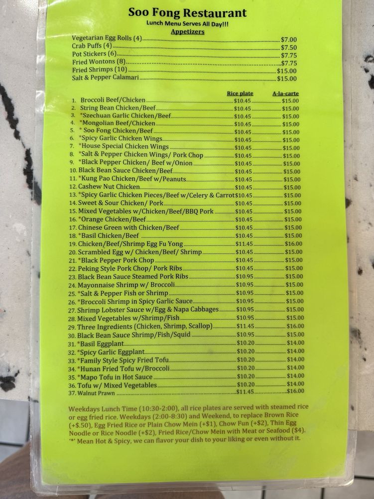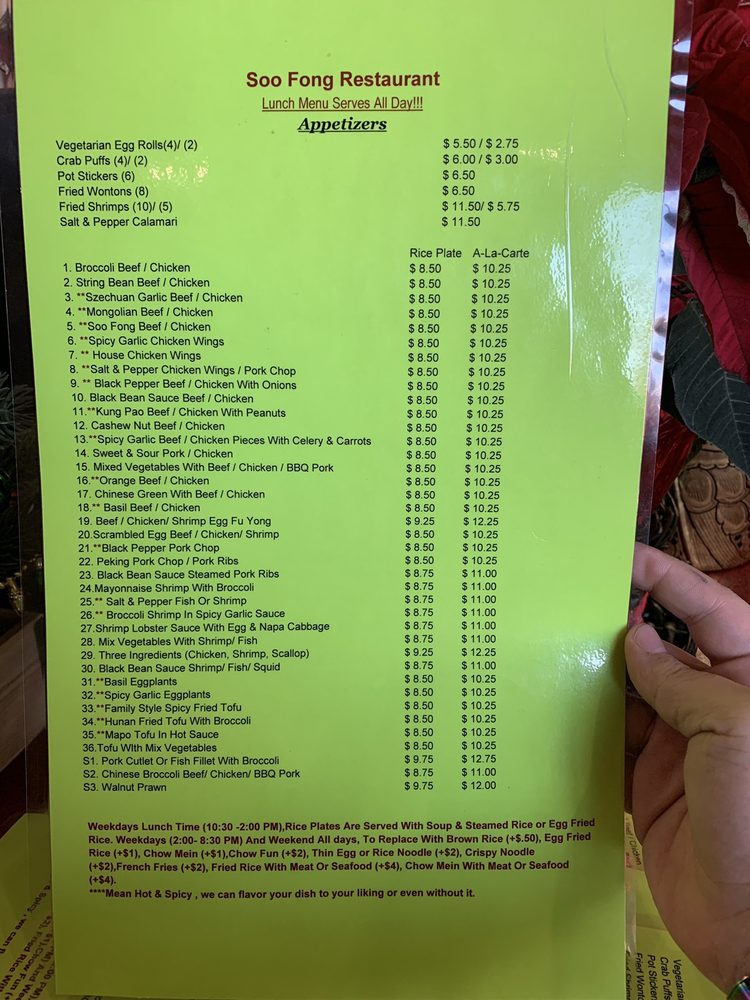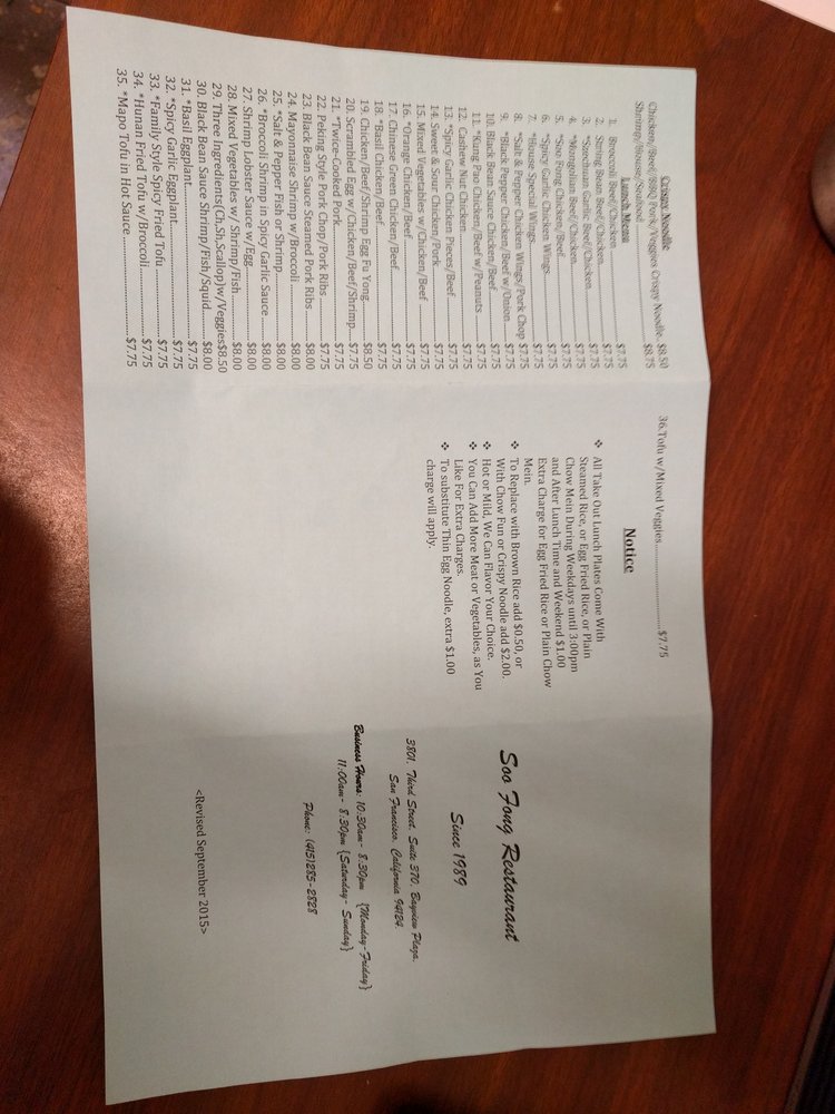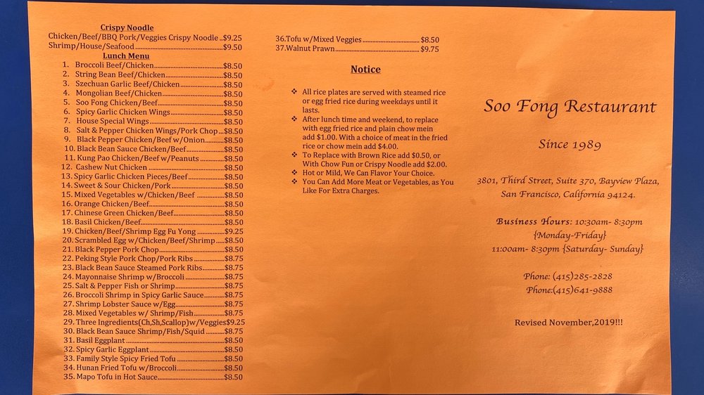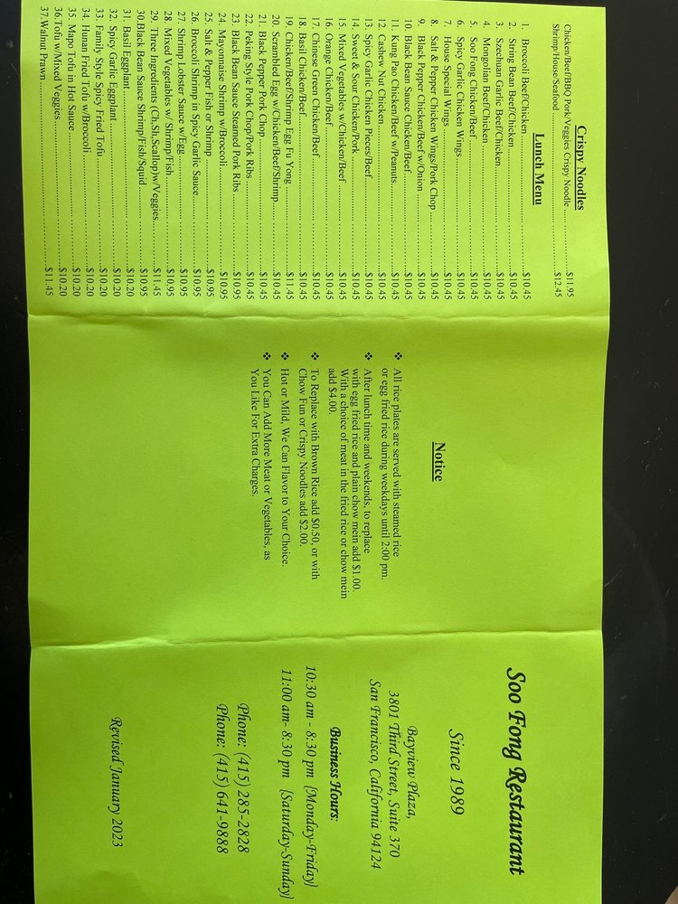 Soo Fong Restaurant in San Francisco offers a variety of Chinese dishes such as Pot Stickers, Beef with Broccoli, and Hot and Sour Soup. With options for vegetarians, those needing wheelchair access, and even customers looking to pay with cryptocurrency, Soo Fong caters to a diverse clientele. Customers praise the restaurant for its friendly service, generous portions, and fresh ingredients. Gloria F. highlighted the excellent customer satisfaction, while Charlotte T. raved about the garlic veggies and crab dishes. Whether dining in or ordering takeout, Soo Fong's efficient service and authentic flavors have won over patrons like Deanna H. and Greg G. If you're craving flavorful Chinese cuisine in a casual setting, Soo Fong Restaurant should be on your list to try.